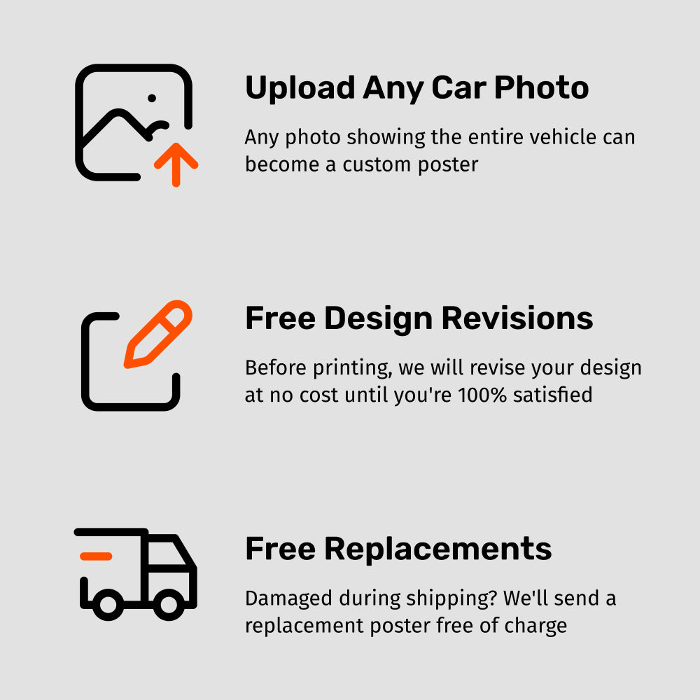 For the best results, please upload a high-resolution photo of your car. Ensure that the image is clear, well-lit, and free from obstructions. Your photo should show your car from the desired angle. Our designers will replicate the exact image and angle for your poster.